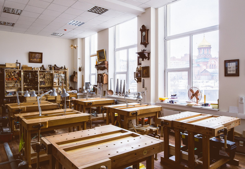 - Верстак ученический столярный с тисками слесарными, защитным экраном, столярным прижимом и табуретом